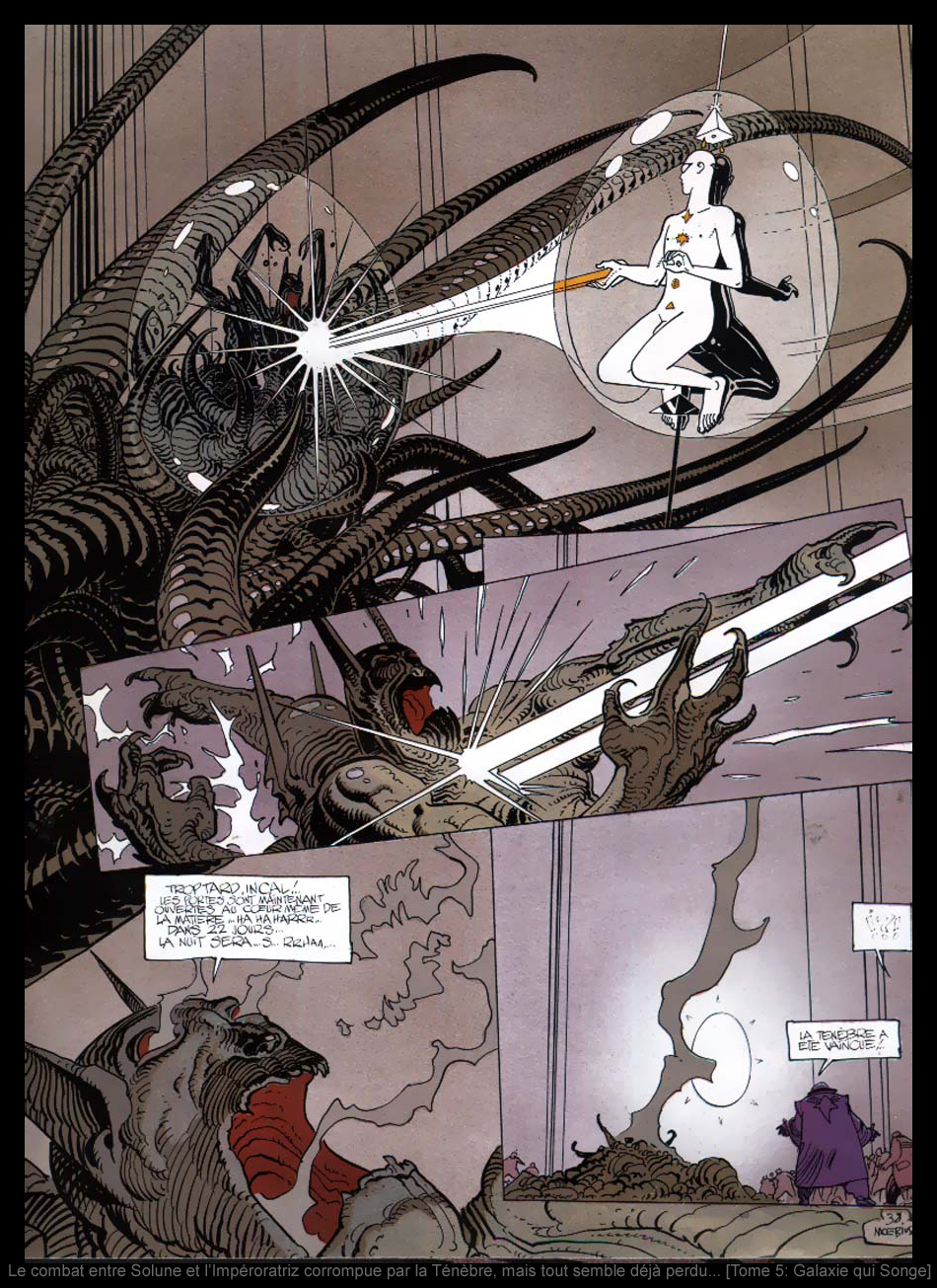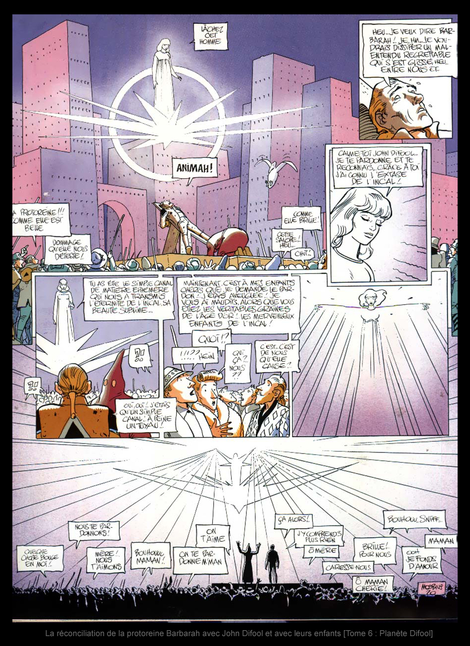 Vient alors la bataille finale entre l'Incal et la Ténèbre, mais je ne la raconterai pas ici. Cette aventure en six chapitres se clôt en effet de façon assez inattendue, que tous les amateurs de science-fiction vont adorer. Je vous laisse le soin de la découvrir, en espérant que le mauvais résumé que vous venez de lire vous en a donné l'envie. Pour conclure ce modeste article, quelques impressions personnelles. L'Incal est probablement la série qui m'a fait aimer la science-fiction. J'ai découvert un grand scénariste en la personne de Jodorowsky. Ce dernier a réussi à créer un univers spécifique qu'il a par la suite décliné en plusieurs "spin-off": Avant l'Incal, Après l'Incal, La Caste des Méta Barons, Les Technopères et Megalex. Pour ceux qui connaissent, c'est le même cas pour une autre grande série mais dans un autre registre: Les Sept Vies De L'épervier, par un autre grand scénariste Patrick Cothias. Quoi qu'il en soit, et si vous n'êtes pas allergiques aux histoires complètement dingues servies par un dessin juste qui retranscrit de manière impressionnante les visions débridées auxquelles on a droit ici, allez-y: plongez dans l'univers de l'Incal.